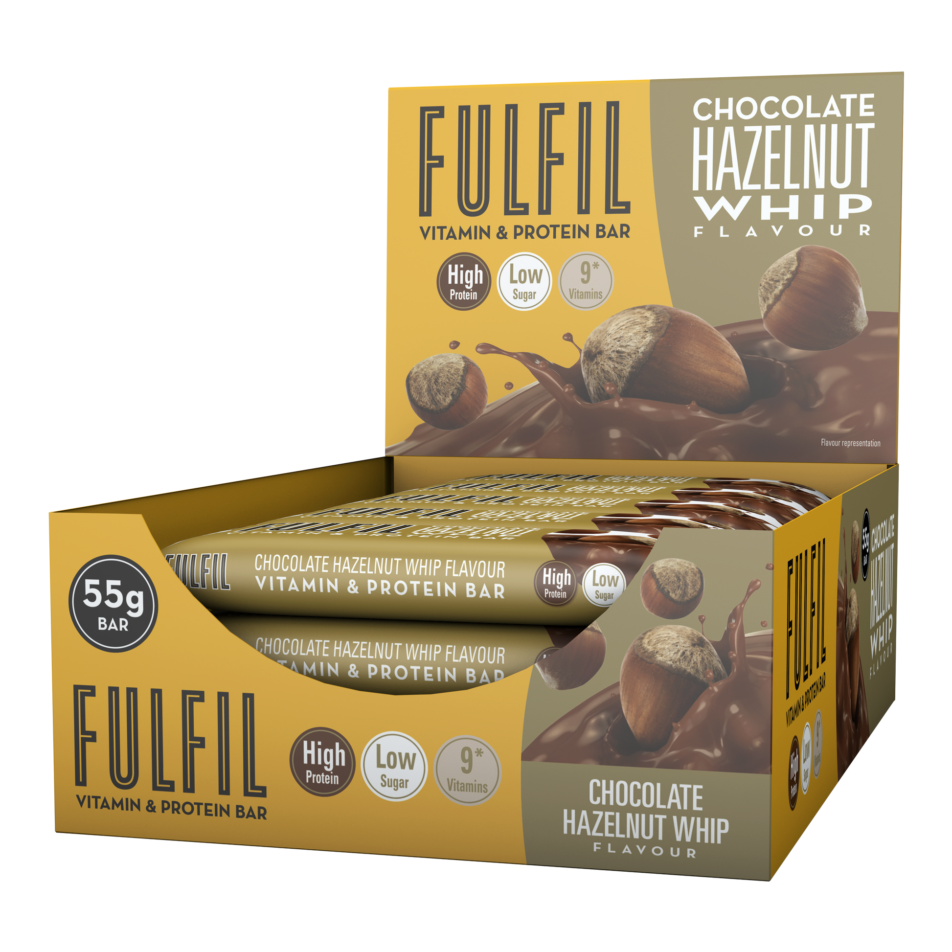 A delicious, chocolatey protein bar with a hazelnut-flavoured filling, covered in creamy milk chocolate and topped with crunchy hazelnut pieces. With the benefits of 20g protein, low sugar and 9 important vitamins.