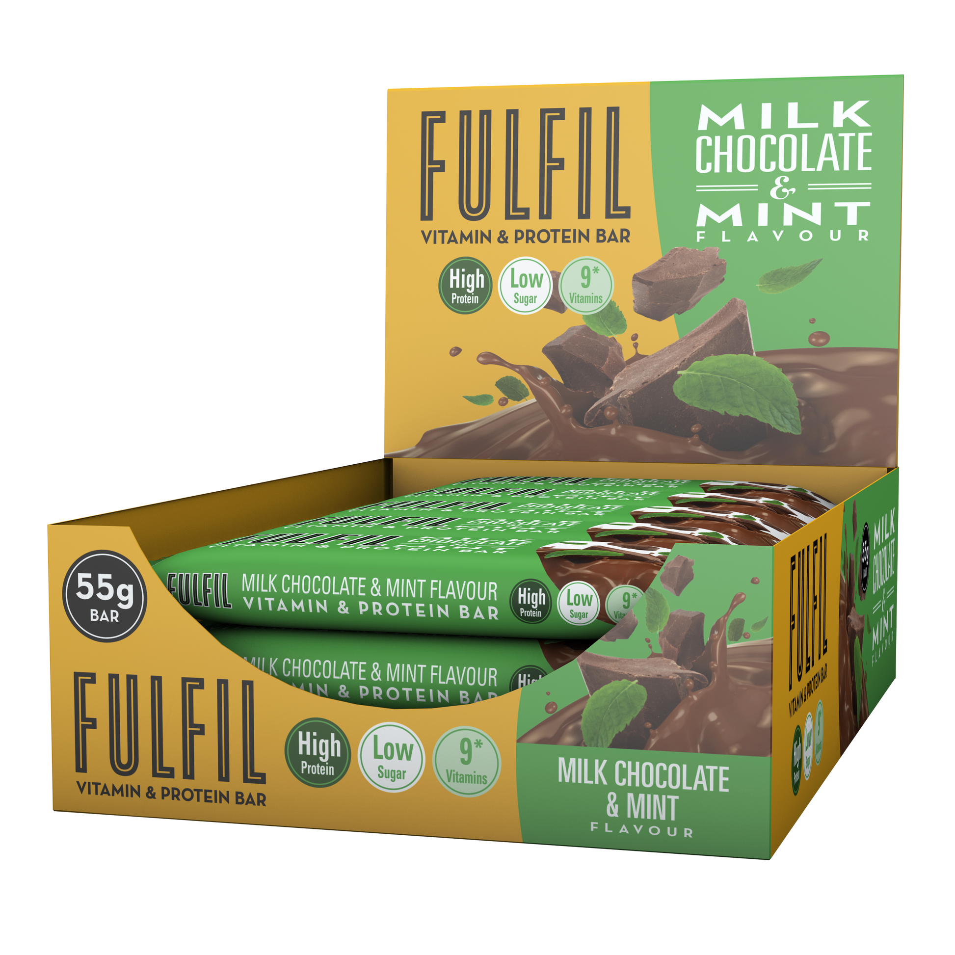 Milk protein, no added sugar milk chocolate with sweetener (20%) (sweetener [maltitol], cocoa butter, whole milk powder, cocoa mass, emulsifier [soya lecithins], flavourings), humectant (glycerol), peppermint flavoured layer (13%) (bulking agent [polydextrose], sweetener [maltitol], cocoa butter, milk protein, whole milk powder, humectant [glycerol], emulsifiers [citric acid esters of mono- and diglycerides of fatty acids, soya lecithins], natural vanilla flavouring, stabiliser [xanthan gum], natural peppermint flavouring), collagen hydrolysate, soya crispies (soya protein, starch, salt), cocoa butter, fat reduced cocoa, soluble corn fibre, chocolate flavoured soya crispies (soya protein, fat-reduced cocoa, starch), soya oil, flavourings (contain milk), salt, vitamins (vitamins C, E, B6, B12, thiamin, riboflavin, niacin, pantothenic acid, folic acid), natural peppermint flavouring, emulsifier (soya lecithins), sweetener (sucralose).